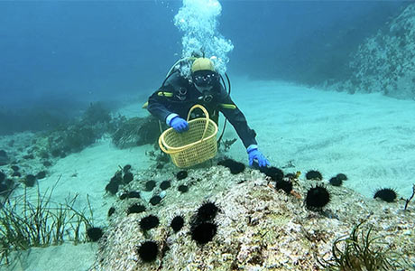 しかしながら、近年の海水温上昇で、海には新たな問題が発生しています。なかでも深刻なのは、生え始めたばかりの海藻に大量のウニが押し寄せ、奪い合うように食べつくした結果、岩肌が真っ白になる「磯焼け」と呼ばれる現象です。砂漠のように磯焼けした海では、海藻ばかりではなく、魚や貝、甲殻類など、生物の姿がほとんど見られません。私たちは「磯焼け」という言葉が世間に浸透する前から、藻場再生手法の研究・実践・検証をおこなってきました。