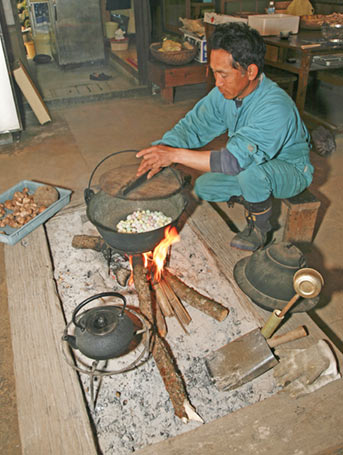 実際「おわて」の空間に身をおくと、生きものの放つ濃厚な気のようなものを感じる。人は様々な動植物のいのちを、食料として、道具類の素材として、あるいは家屋を支える建材として、有り難くいただく──かつて当たり前だった営みがいまも大切に受け継がれているからだろう。そこに暮らす人間を含め、家そのものが一つの生態系をなしているといってもいい。 そんな時松さんの民宿で振る舞われるのは、地元でも作らなくなった伝統食ばかりだ。さすがに狸汁はもう出ないが、自慢の黒米や赤米をかまどで炊き、採りたての山菜料理や素材から手づくりした豆腐、コンニャクなどととりあわせる。しぼりたてのヤギのミルクも絶品だ。薪の火の温もりとともに守られてきた昔ながらの食の、何と豊かなことか。 「いまの子どもが食べているのは食べ物じゃなくてエサ。あれじゃあ身体は肥えても、心は肥えられんのよ。かけがえのない自然の恵みがどうやって自分のいのちにつながるのか、忘れられようとしている食べ物の“物語”を、せめてうちに来た子どもらにはちゃんと伝えていきたいんです」 訥々とした時松さんの言葉に、令子さんも大きくうなずいた。