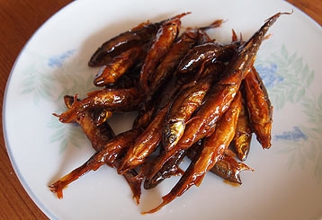![[photo]](image/photo_06.jpg) ホンモロコの煮つけ。骨まで軟らかいから子供でも丸ごと美味しく食べられる。ホンモロコは近年、漁獲量が減って値段が上がり、地元の家庭の食卓にも届きにくくなった