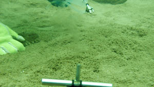 自ら海に潜り湧水を採取する張教授(右)。湧出口に差し込んだパイプから淡水が噴き出しているのが見える