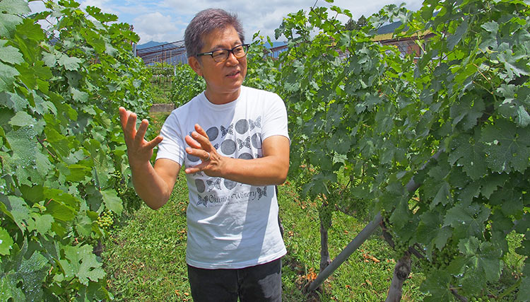 シャルドネ、カベルネ・ソーヴィニヨン、メルロといえば、ワイン好きなら誰もが知っているヨーロッパを代表するワイン醸造用のぶどう品種である。世界に誇れる高品質のワインを造りたい……中村さんがこれらの品種の栽培を手がけるきっかけをつかんだのは、大学卒業後、勝沼の老舗ワイナリーに入社して数年たった26歳のときだった。 |
