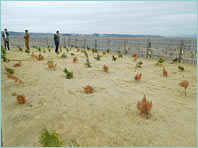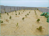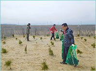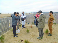 福島県の海岸防災林再生に貢献するため、昨年、10月2日(日)に相馬セブンの森0.3haに害虫に強い抵抗性クロマツ1,500本を植樹しましたが、残念なことに枯れてしまった苗があり、2018年はセブン-イレブン本部社員とボランティアの8名で補植を行いました。