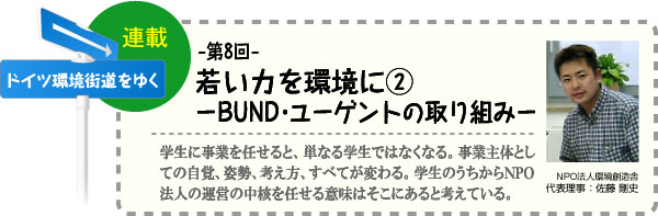 私も、九州大学の学生と共にNPO活動をしているのでよくわかる。彼らに事業を任せると、単なる学生ではなくなる。事業主体としての自覚、姿勢、考え方、すべてが変わる。学生のうちからNPO法人の運営の中核を任せる意味はそこにあると考えている。 BUNDのユーゲントというシステムは、マックスやニナのような存在を育てるためのシステムなのである。 |