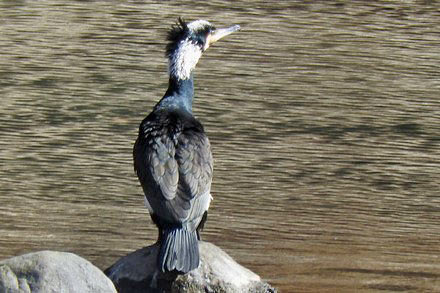 名前の通り川に生息する鵜。1970年代には全国で3,000羽以下まで減少したが、近年は個体数の増加が著しく、全国で15万羽以上と推測され、漁業への食害が各地で問題化している。公害規制による河川の水質改善で、餌となる魚が増えたことなどが増加の理由として考えられる。飯田高原では標高の関係か、姿を見ることはまれ。繁殖期には写真のように頭部が白くなる。留鳥。雌雄同色。