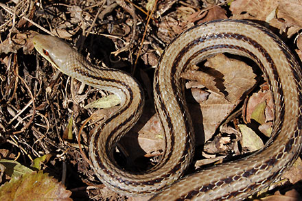 体に縦に縞が入っている蛇。毒はなく田んぼ近くに多く生息し、カエルやネズミなどを食べる。飯田高原では最も普遍的に見られる蛇の一種。