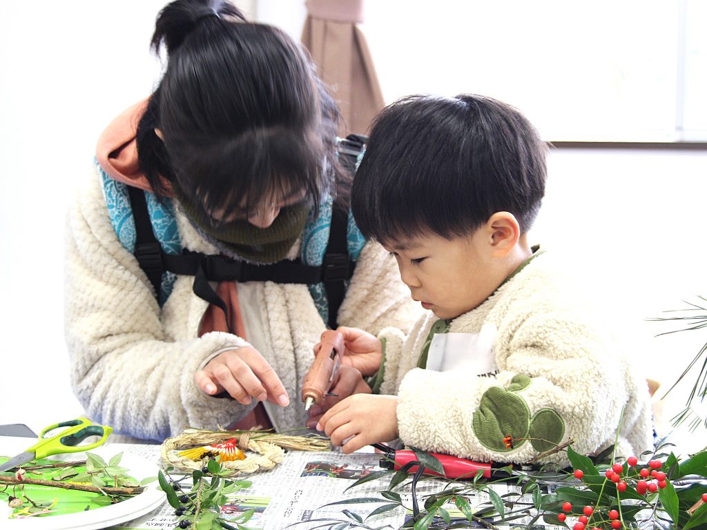 毎年恒例、自然学校の一年の最後をかざるプログラム「しめ飾りとミニ門松づくり」を今年も実施しました。しめ飾り・門松共に年末に年神様を家に迎える準備として作られる伝統的な縁起物の一つですが、自分で作った経験のある方は意外と少ないのではないでしょうか。