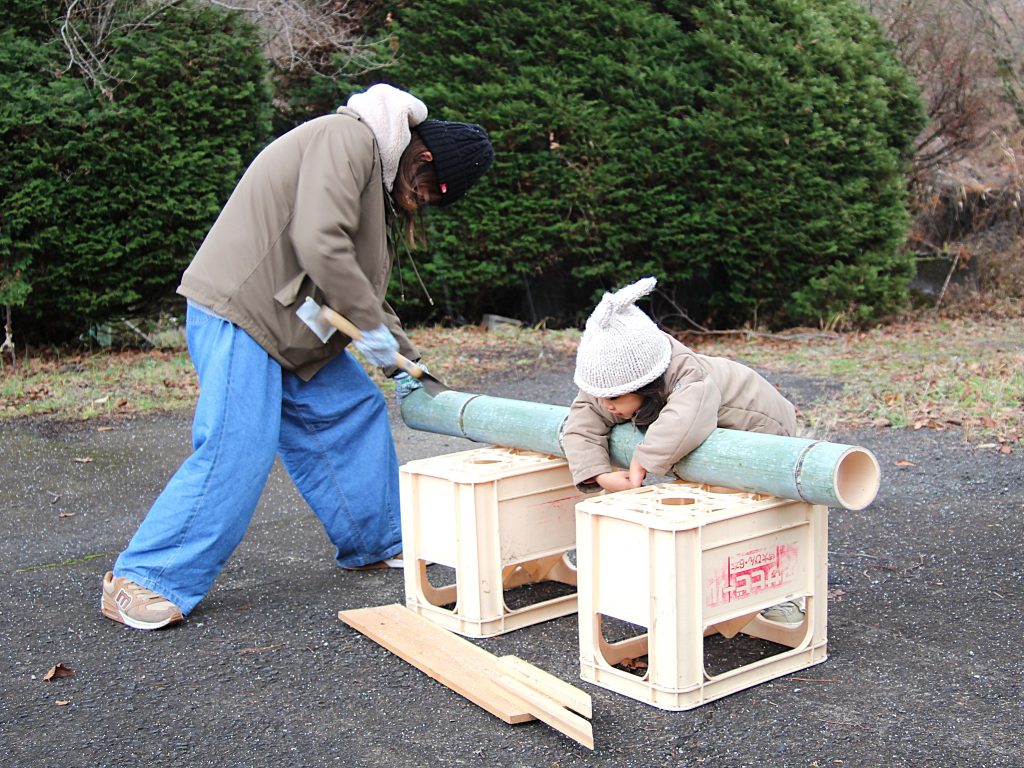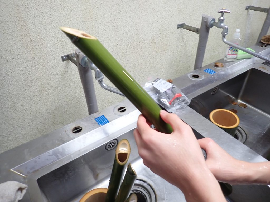 まずは土台となる竹と中に入れる三本の竹を切ります。結構力のいる作業になります。