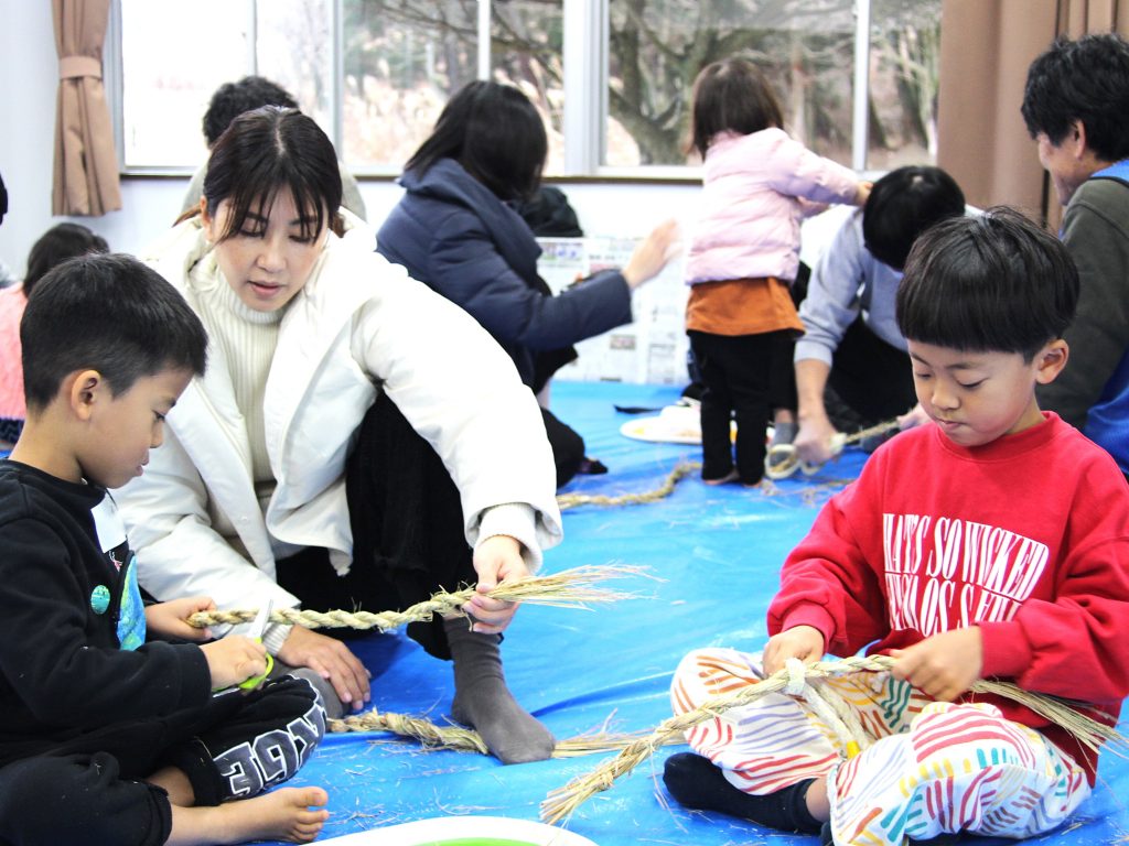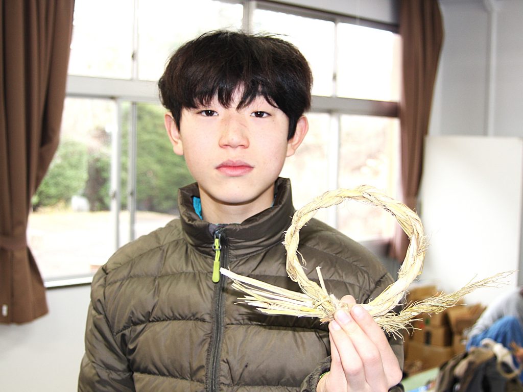 しめ飾りには自然学校の「自然共生型田んぼ」で育てた稲の藁(わら)使います。最初に藁を叩いて柔らかくしてから縄を綯(な)っていきます。今回は19本(奇数は割り切れないことから縁起が良い)の藁を使って左綯いでしめ飾りを作りました。