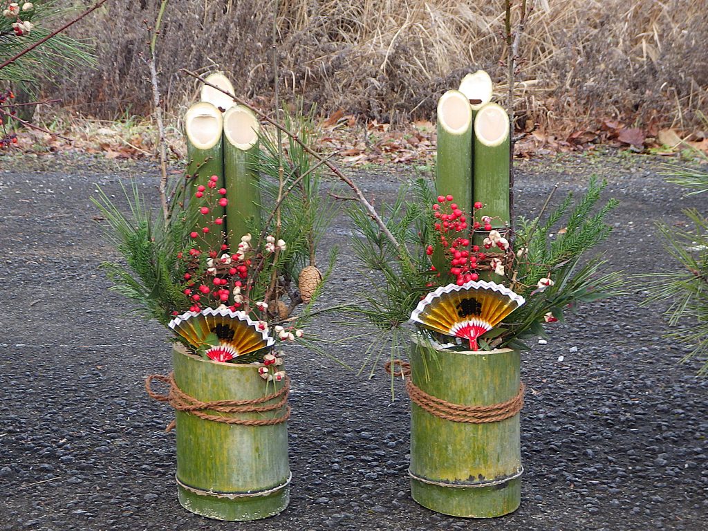 これにて竹の準備は完了です。次は中の3本の竹を土台の竹に入れて砂を詰めていきます。土台の竹の上部から1cm下くらいまで砂を詰め終わったら松の葉や梅の枝を刺して飾り付けをし、土の表層には白い石を敷き詰めます。最後に、3本の竹と土台の竹にシュロ縄を三重(これも奇数)に結べば完成です。