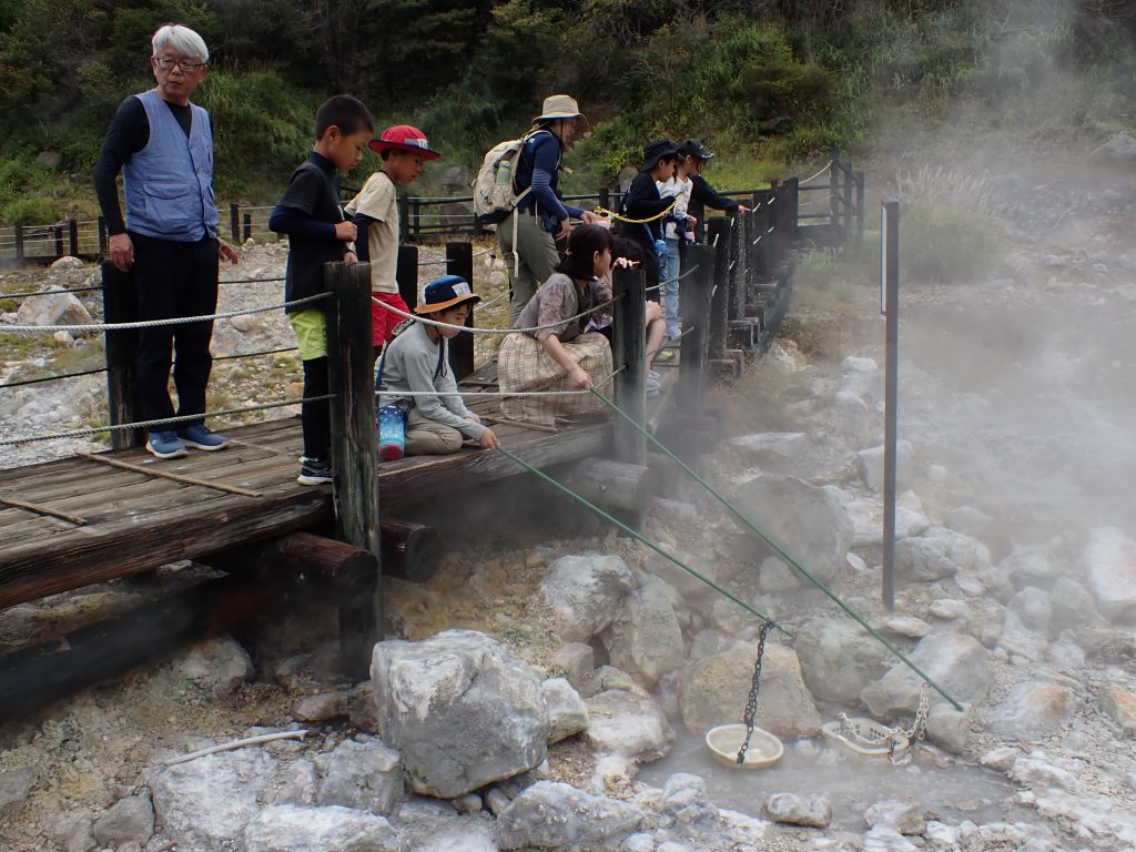 その後は、火山の蒸気が噴き出し、熱泥が沸き立つ自然の驚異を間近で体感することができる小松地獄へ行きました。ボコボコと沸いている熱泥の中に、卵をつけるとゆで卵ができることに子どもたちはとても驚いていました。