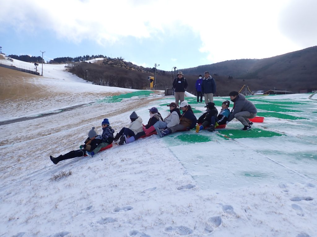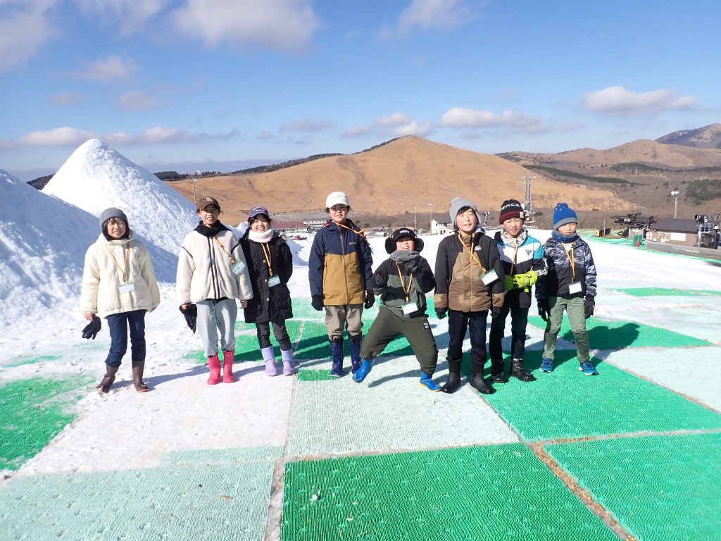 午前中は九重スキー場に行き、オープン前のスキー場で色々な体験をさせていただきました。最初にスキー場の方から、九重町にスキー場ができたきっかけや、雪作りの様子について教えていただきました。