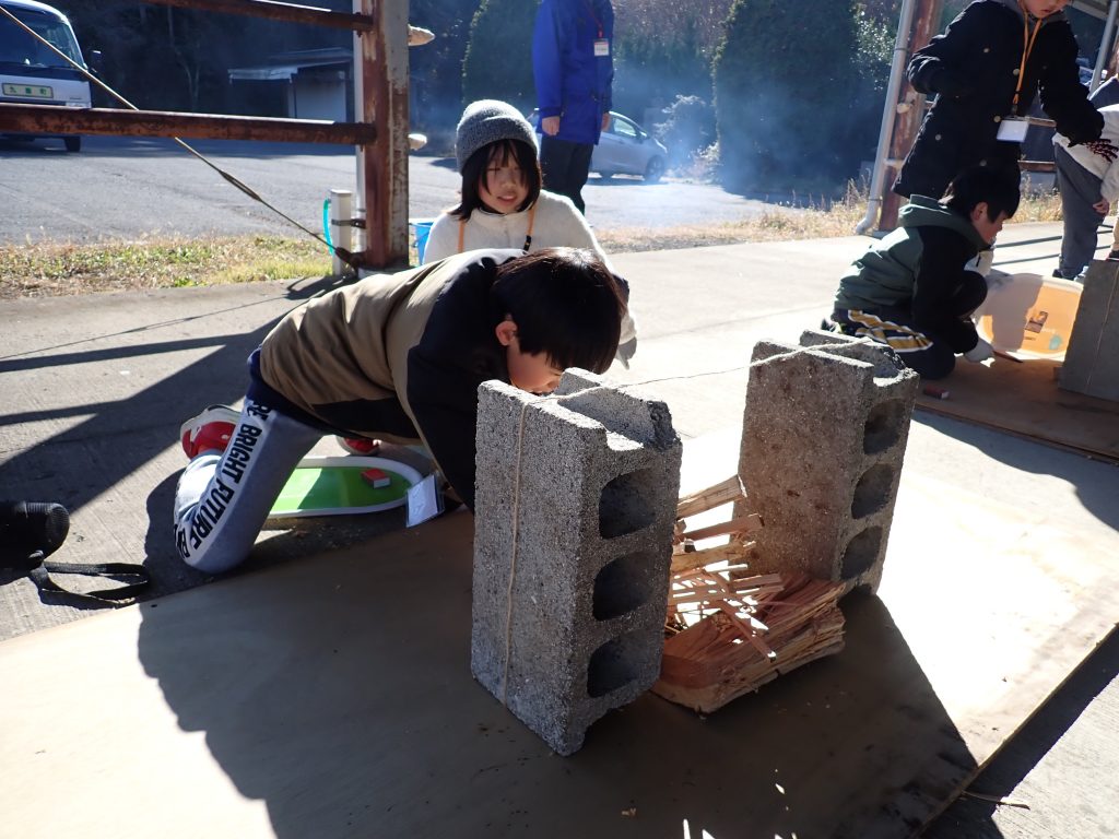 午後は寒い冬でも外遊びが楽しくなる焚火体験を行いました。今回は2人1組に分かれ、協力して焚火の炎で紐を切る挑戦をしました。2人で相談して役割を決め、手分けをして焚火の材料を確保し、励まし合いながら頑張っていました。炎で紐が切れた時は、子どもたちだけでなくスタッフからも歓喜の声が上がりました。