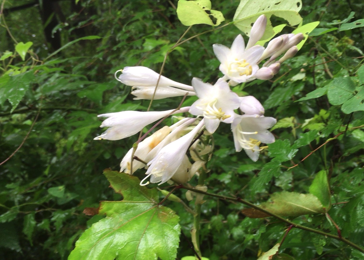 大きな葉っぱに白い花が、夏の雑木林の深緑に生えます。