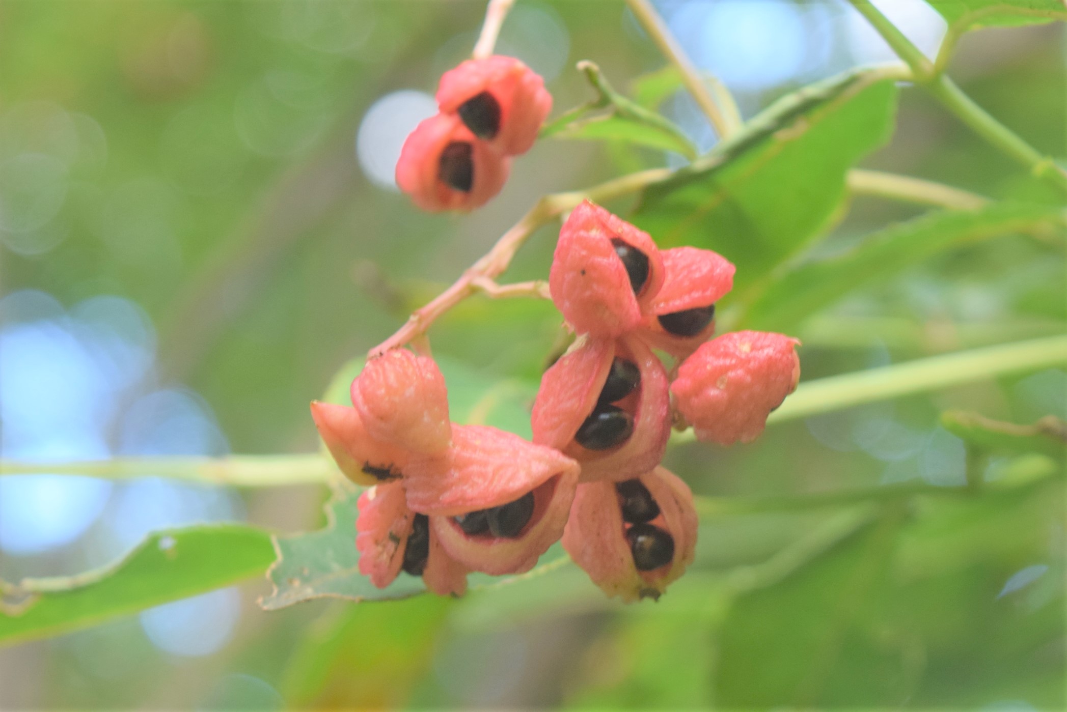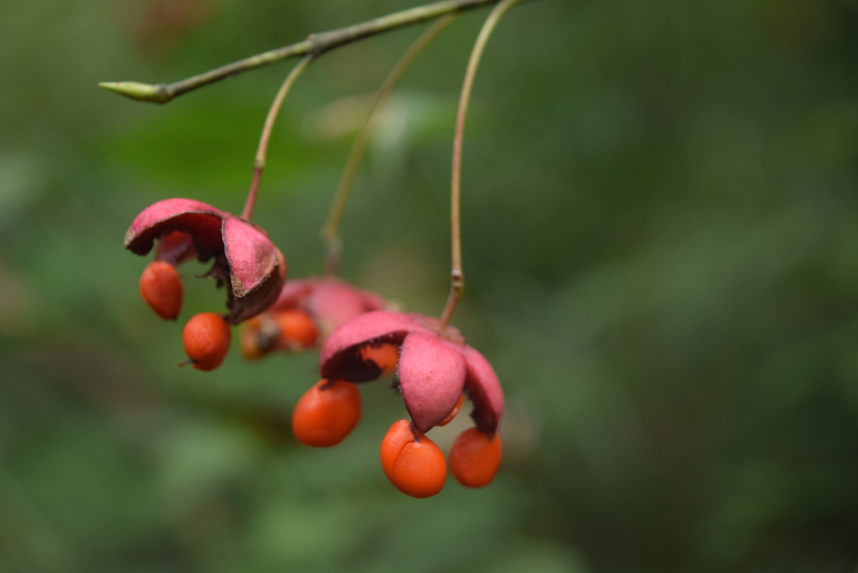 赤く色づいた実が下向きに割けて、中から種がぶら下がるように出てきます。名前のごとく、枝から吊るされているように花がつき、実がなるので、風が吹くとユラユラ揺れて可愛らしい木の実です。