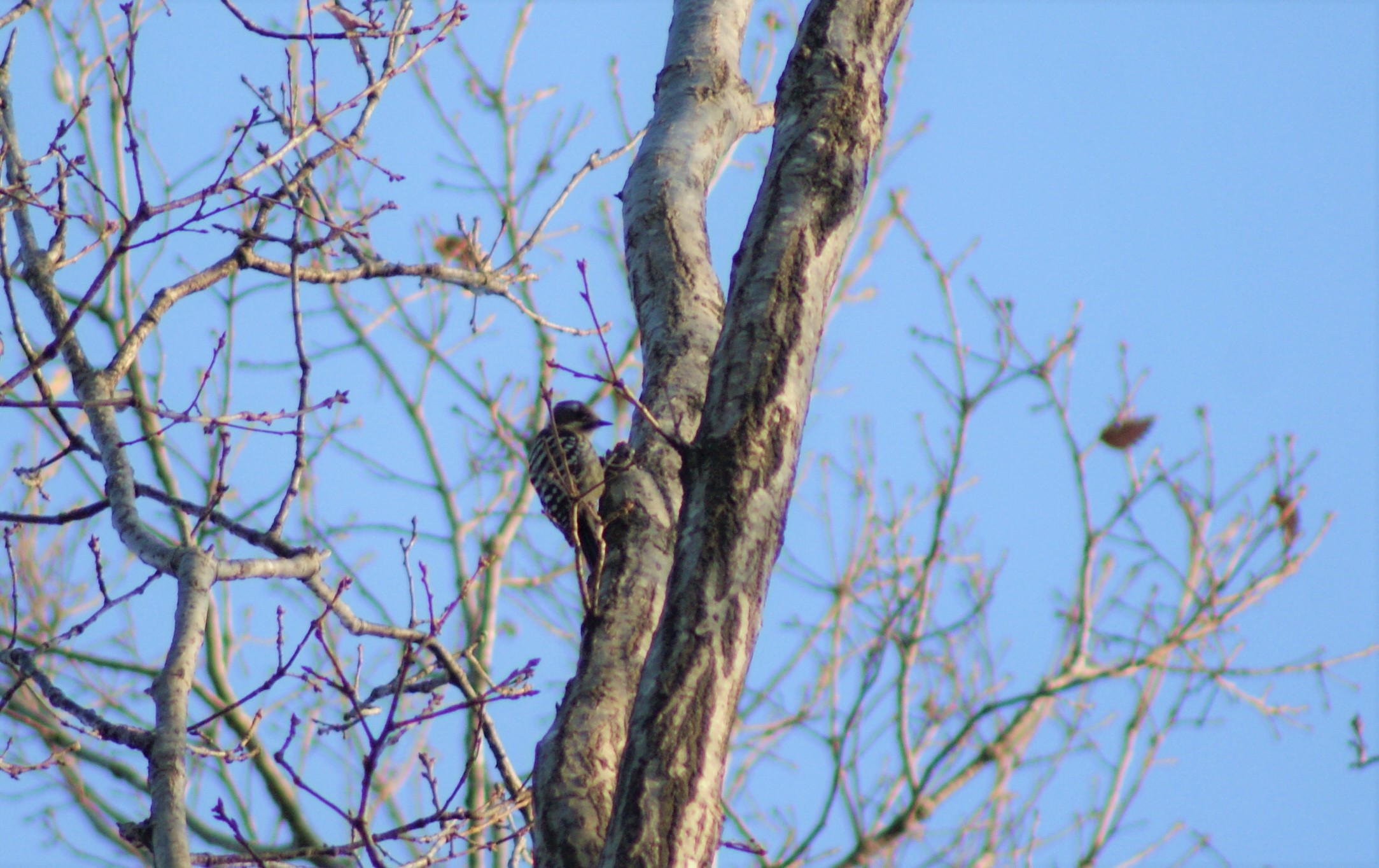 スズメと同じくらいの大きさのキツツキの仲間です。♪ギィーとドアがきしむ音のような鳴き方をします。また、森の中で耳を澄ませると木をつつく音が聞こえます。