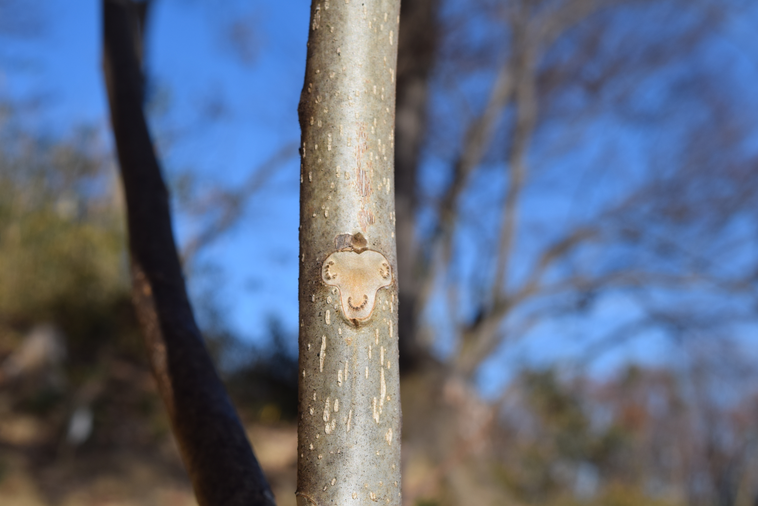 葉っぱの落ちた跡(葉痕)がまるでサルの顔のように見えませんか? とぼけた顔、笑った顔、見ざる、言わざる、聞かざるなどなど。どんな顔に見えるか探してみてください。
