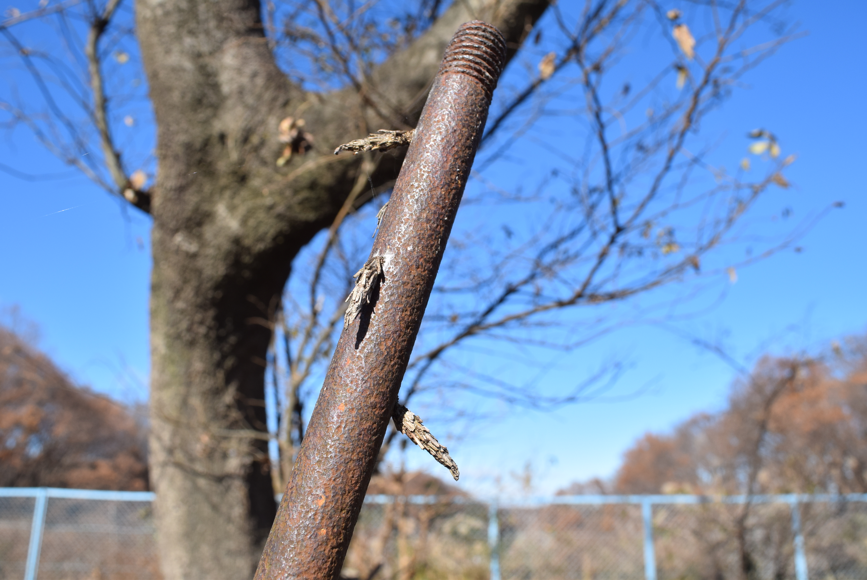 ミノガのなかまの幼虫。枝などにくっついて冬を越す。鉄のパイプに雑魚寝中。