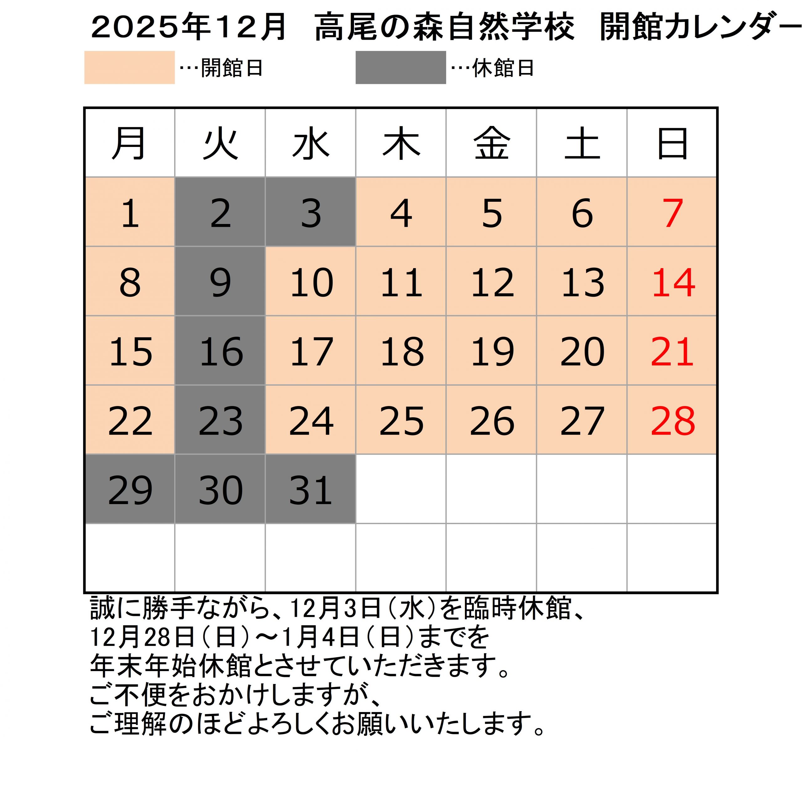2025年12月の開館日は以下の通りです。