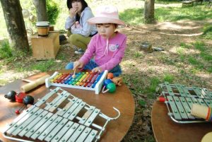 ■自然の音で曲作り 鳥の鳴き声や木をたたく音、手作り楽器の音でみんなで曲を作ります