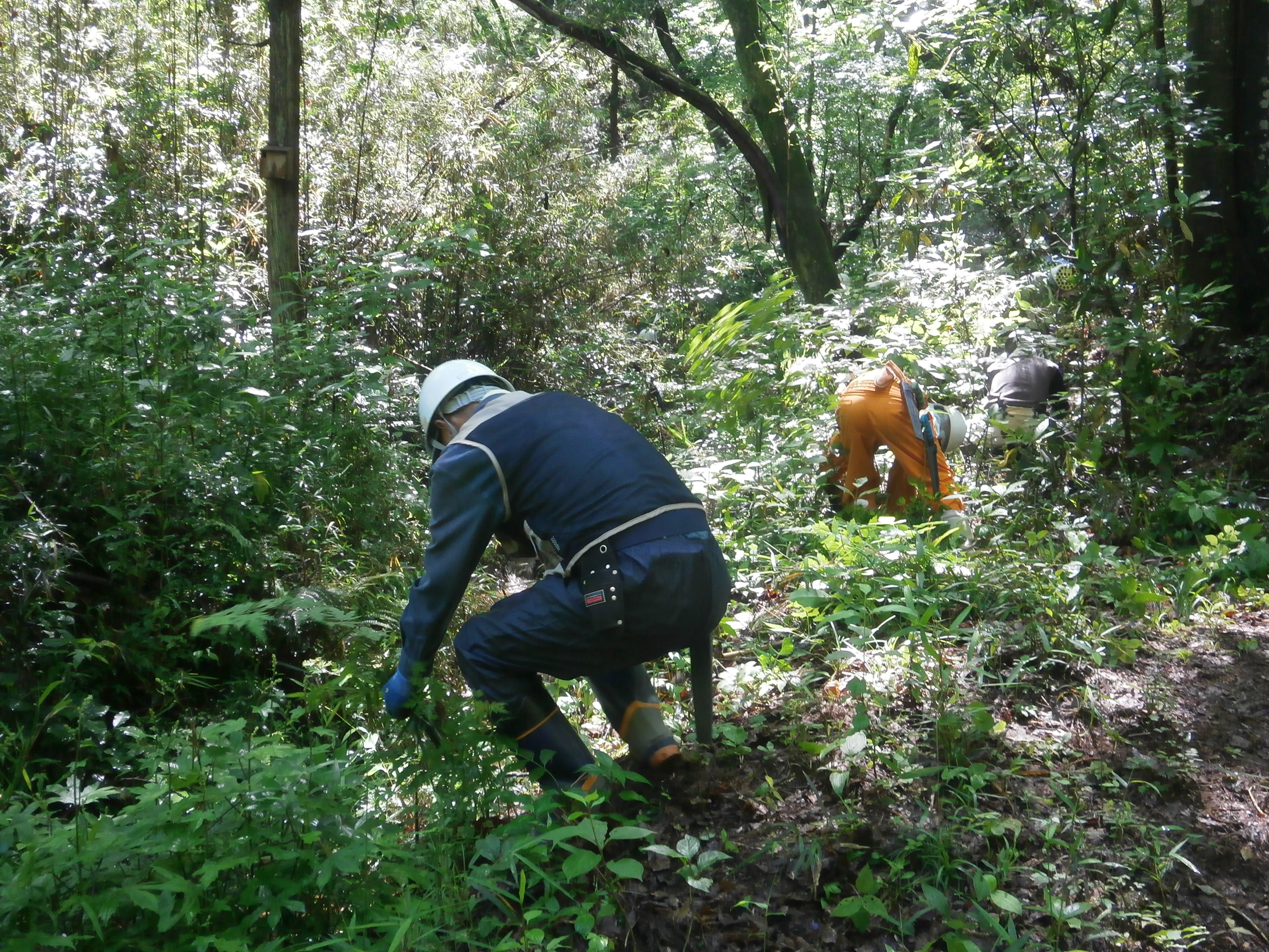 高尾の自然保護・保全 「第90回 森のお手入れボランティア」を実施しました。 2019年6月16日(日) 今回の森のお手入れボランティアは沢地沿いの散策路整備を行いました。 1.低木の伐採 2.沢のかいぼり作業 3.階段作りも行いました 道を作りながら沢の中の落ち葉をかき出し、水の流れを良くしました。斜面地には階段を作り、明るく開けた道を開通することが出来ました。 4.整備前 5.整備後
