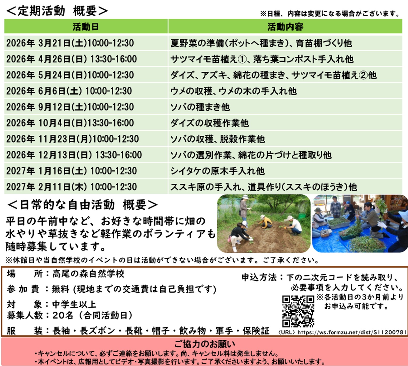 高尾の森自然学校の畑では伝統野菜等の固定種を中心とした作物を作り、種を次世代につなげていく活動を行っています。生きものと共生を目指した畑活動に 参加してみませんか?畑作業の他にも、ウメの木・ススキ原のお手入れなど “里地”を守る活動も行っていきます。 また、お手すきの時間に日常的に参加できる方も大歓迎です。みなさまのご参加をお待ちしております。