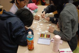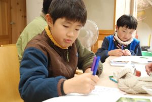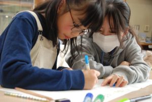 12月14日の「ジュニボラ」はあいにくの雨… 今回も7月の活動と同じように「環境アカデミー」の学生と一緒に屋内で活動を行いました。来年、残すところ2回になった活動で何をするか、もう一度意見を出し合いました。その後、散策路の「沢の源流」や「ヒミツキチ」などの看板をデザインしました。アカデミー生にサポートしてもらいながら、グループごとに自由に描き上げることができました。看板は次回設置予定ですのでお楽しみに!(川村)